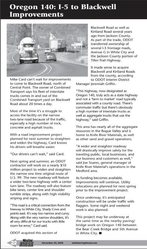 OR140_I-5 to Blackwell Road Improvements_NOV 2020 ODOT Moving Ahead publication.jpgAn ODOT Moving Ahead story on the OR 140:Exit 35 to Blackwell Road project