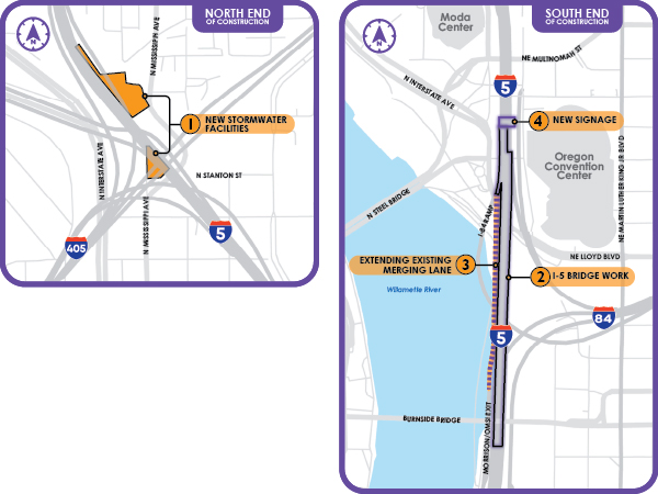 - Extension of the southbound auxiliary lane along I-5 between the I-84 and Morrison Bridge/OMSI exits