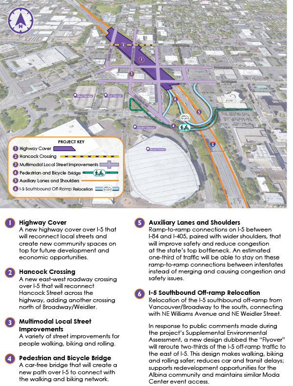 As envisioned in its entirety, the project will make travel more predictable and safer for people driving and transporting goods on I-5 between I-84 and I-405 by adding auxiliary lanes and shoulders that smooth traffic flow. The project includes a highway cover to reconnect the Historic Albina neighborhood and street improvements that will enhance safety and access for people walking, rolling, biking, riding transit and driving on local streets. The project will support the regional economy, future economic development and a more connected Albina community. Learn more here.