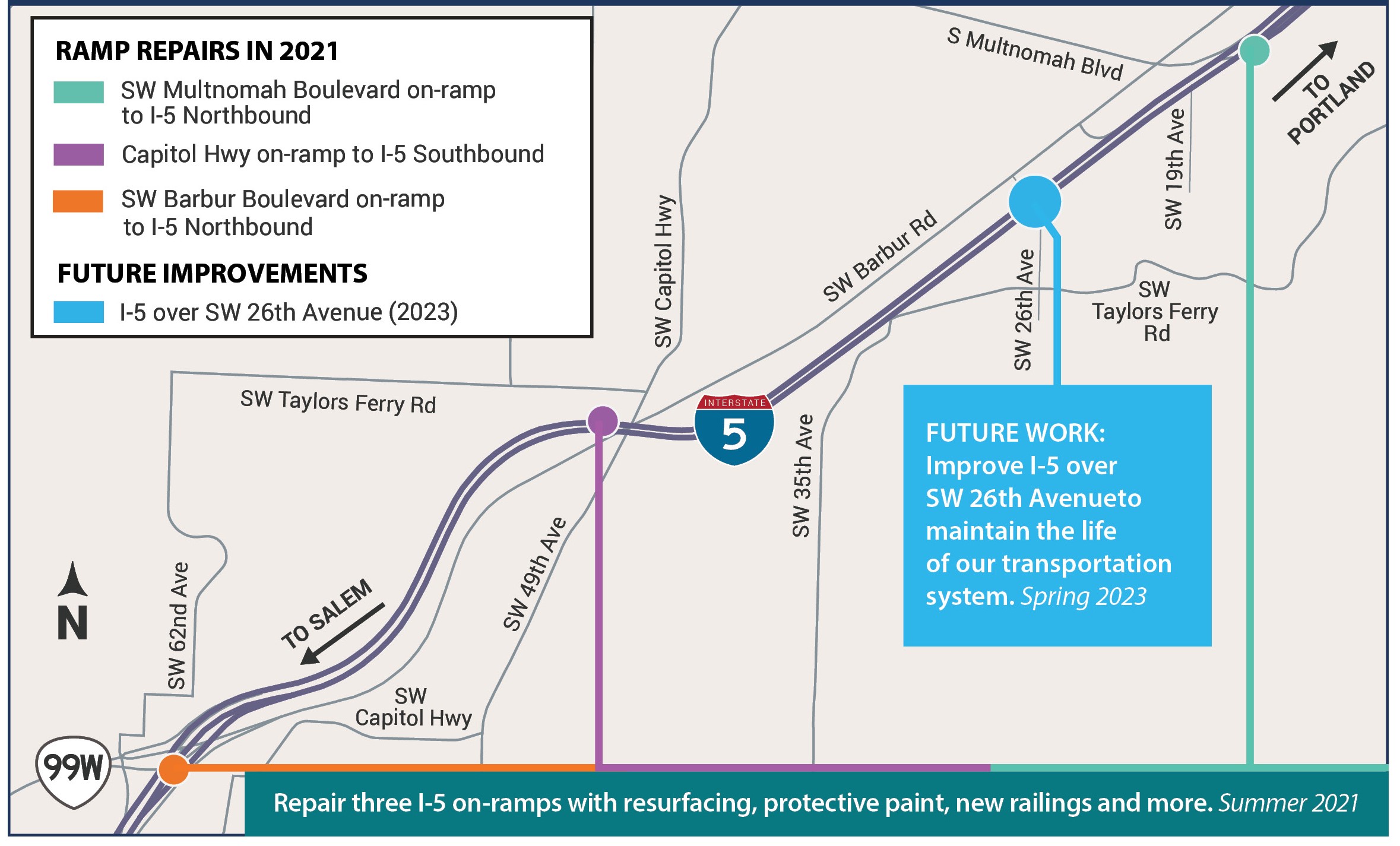 Construction to repair three on-ramps to Interstate 5 in SW Portland starts July 2021 including: