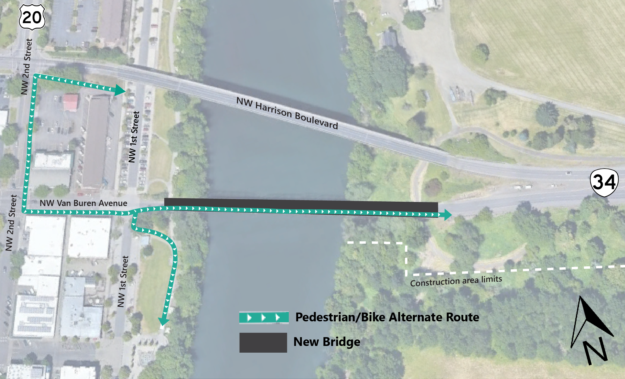 The new earthquake ready bridge will be built in the existing location, and will include two eastbound travel lanes, a bike lane, and a protected bicycle and pedestrian path. There will also be improvements to the intersection of Van Buren Avenue and NW First Street, where a new signal will replace the current flashing yellow pedestrian crossing light.
