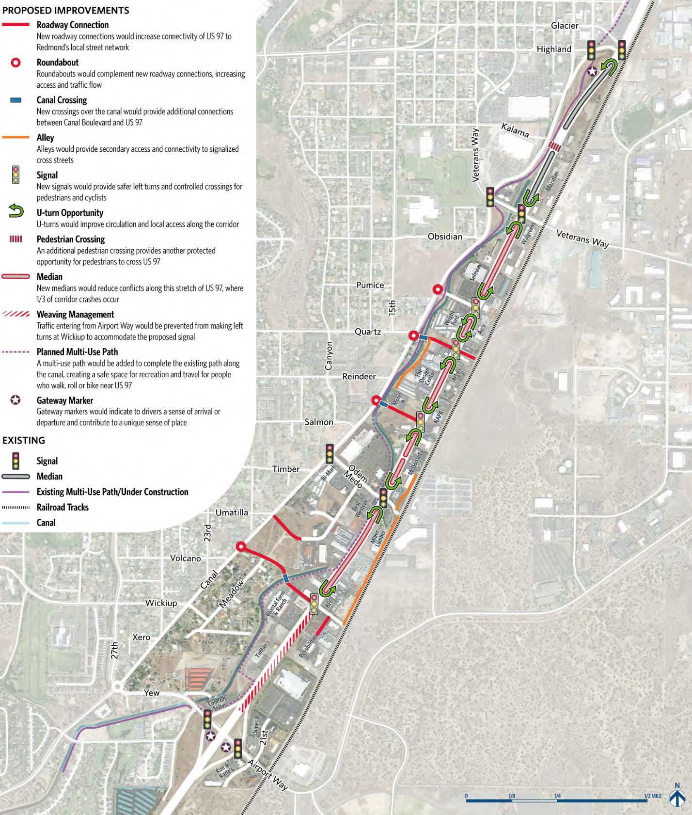 The plan outlines improvements such as signal upgrades, signal installation, medians, sidewalks, cycle tracks, pavement preservation, additional city street connections between U.S. 97 and N. Canal Boulevard, etc. The preservation work includes a rebuild of U.S. 97 within this corridor.