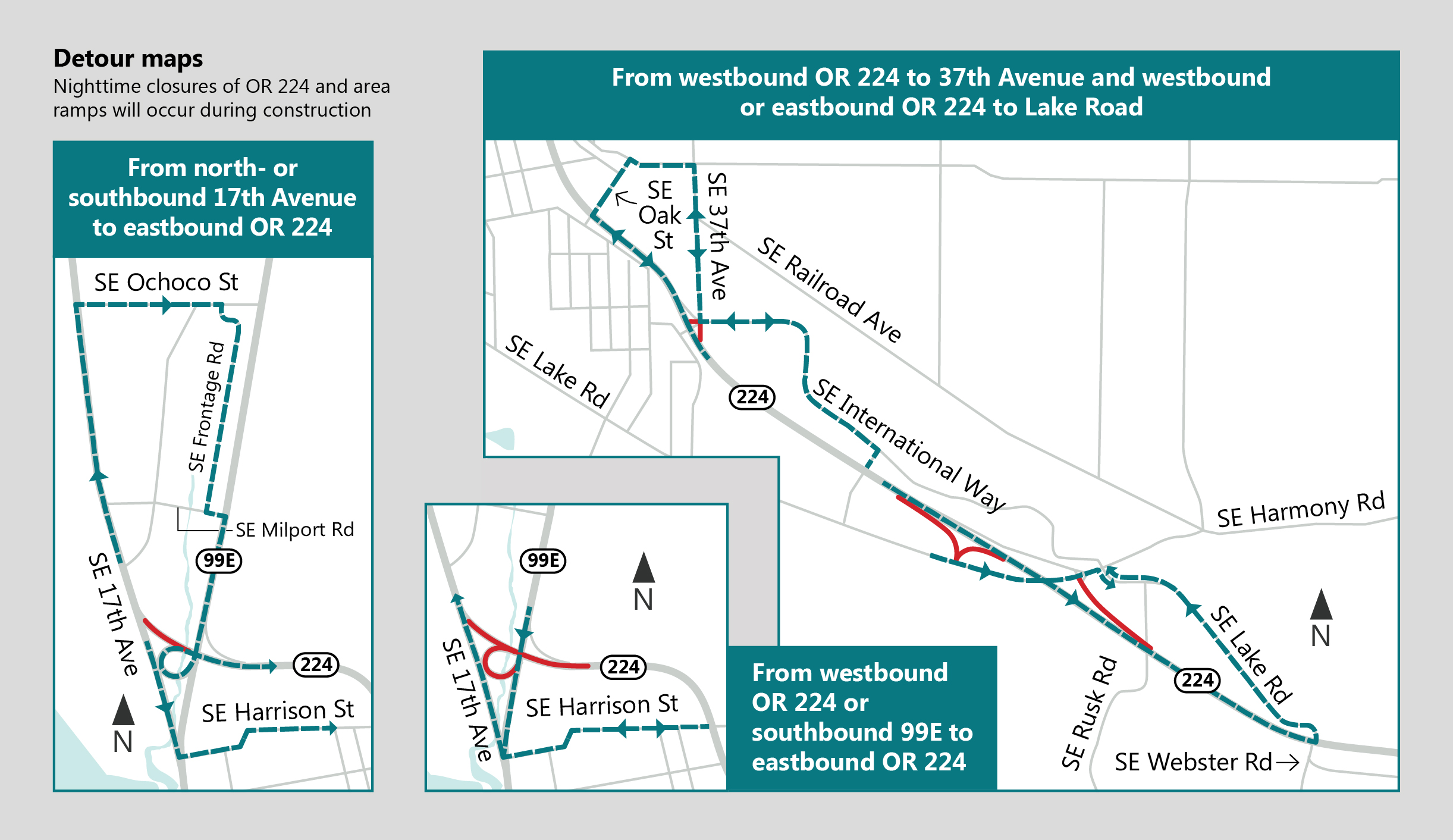 - Detour routes will be posted online and on reader boards on OR 224 when closures occur.