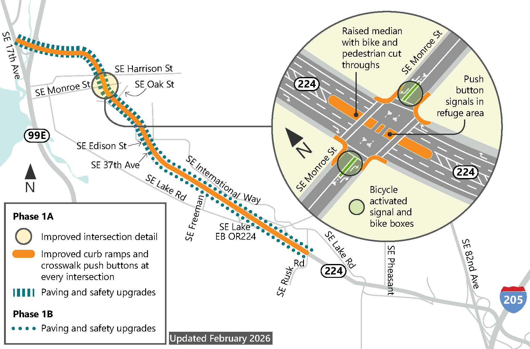 - Safety improvements for pedestrians and people biking and rolling throughout the corridor and at SE Monroe Street Greenway intersection with OR 224.