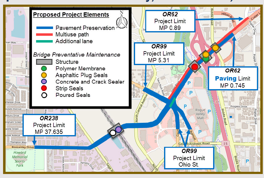 Maintains the failing asphalt and striping at this busy Medford intersection. It will also rehabilitate the existing bridge transitions, bridge decks on the Oregon 62 bridges over Interstate 5 and Biddle Road as well as the Oregon 238 over CORP railroad bridge.