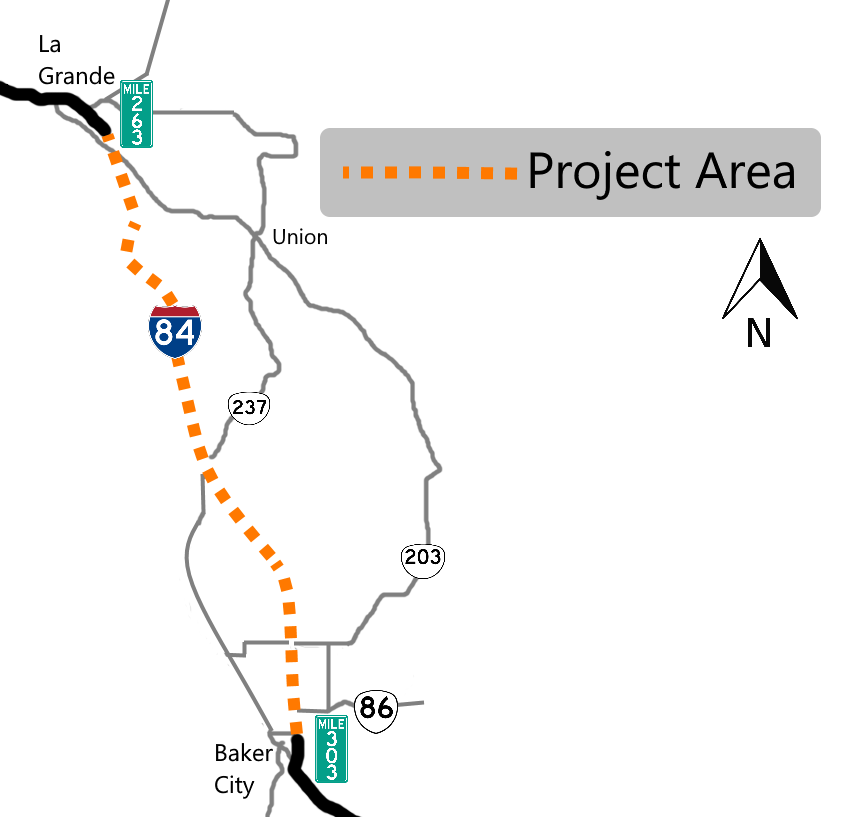A Variable Speed Limit System was installed in 2016 along a 30-mile segment of I-84 in the Baker Valley, from milepost 277 to 306.