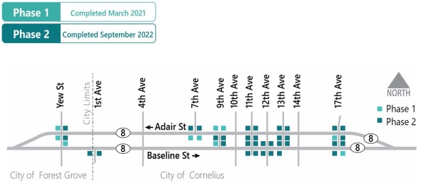 We replaced existing, non-compliant sidewalk curb ramps along OR 8 (Adair and Baseline/Pacific streets) in Cornelius and the eastern end of Forest Grove. Curb ramps at 13 non-signalized intersections on both sections of the one-way couplet from North 17th Avenue to Yew Street.