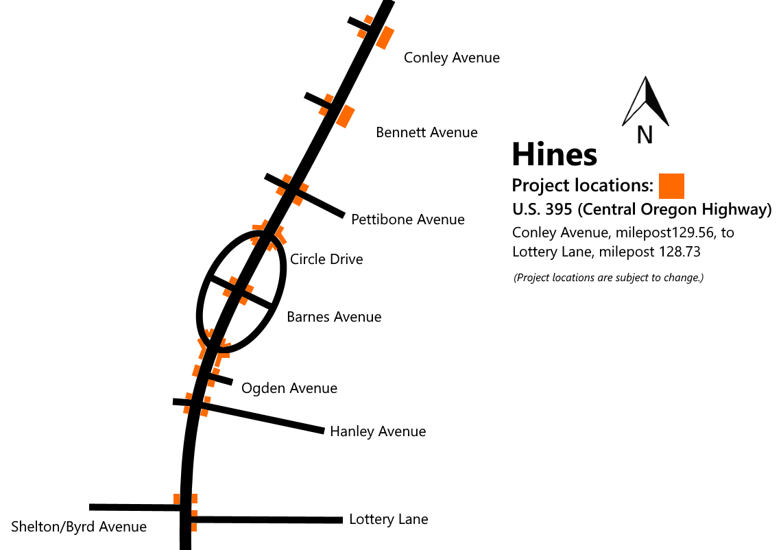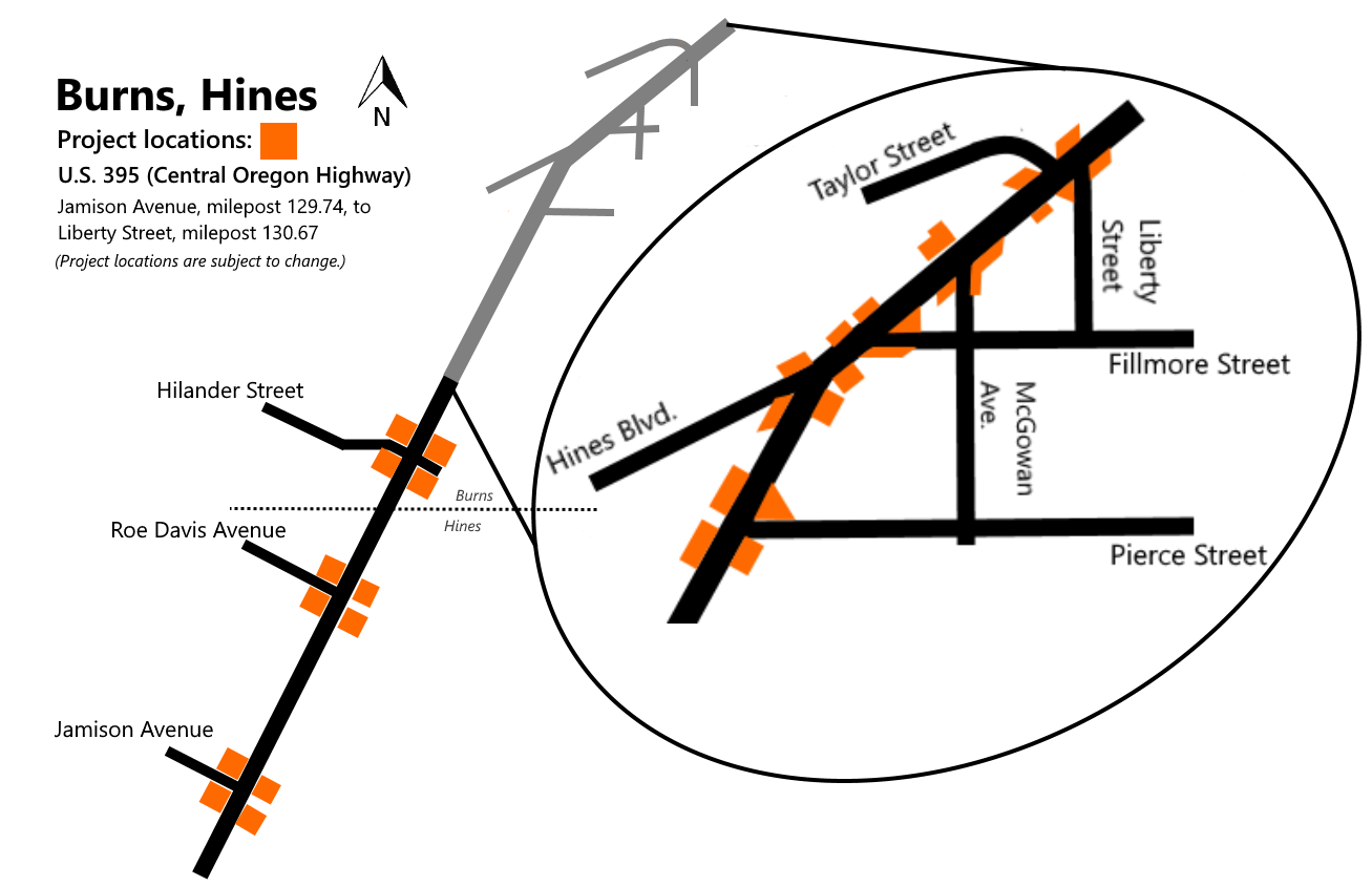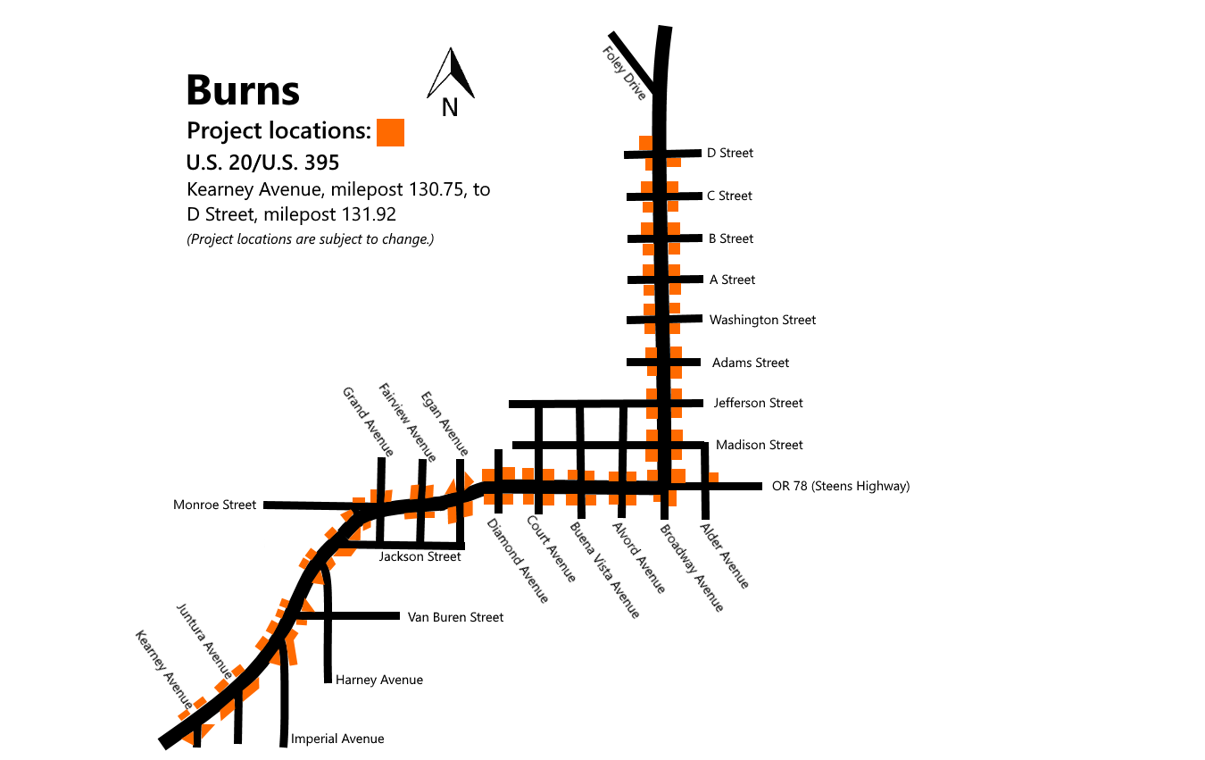 - U.S. 395: John Day-Burns Highway, from Lottery Lane, milepost 128.73, to Roe Davis Avenue, milepost 129.98.