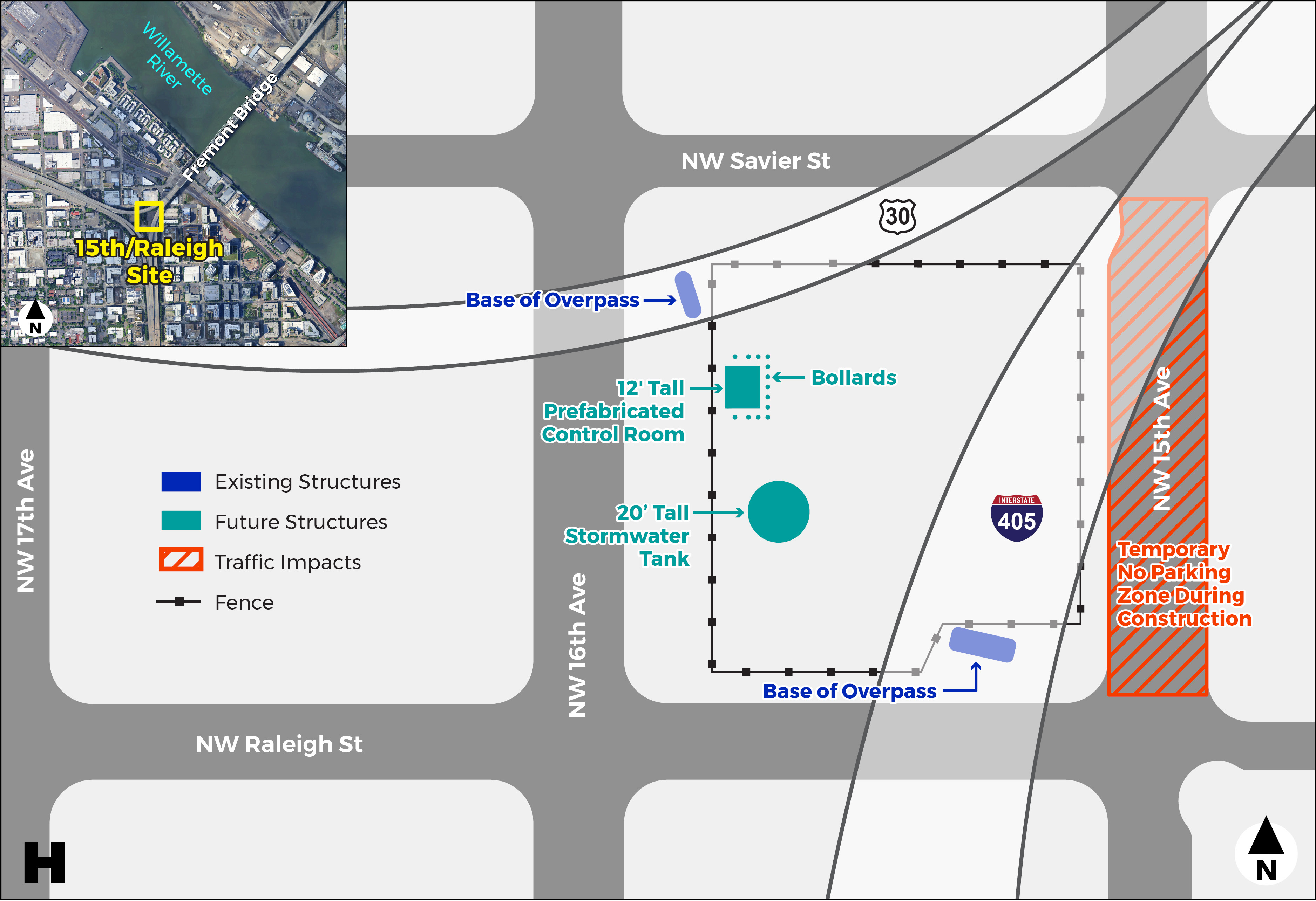The largest underground stormwater treatment system within the project is planned at 1500 NW Raleigh Street. The site will have an approximately 12’ tall, prefabricated control room and an approximately 20’ tall storange tank to help manage the underground filtration system; both will be visible from the street.