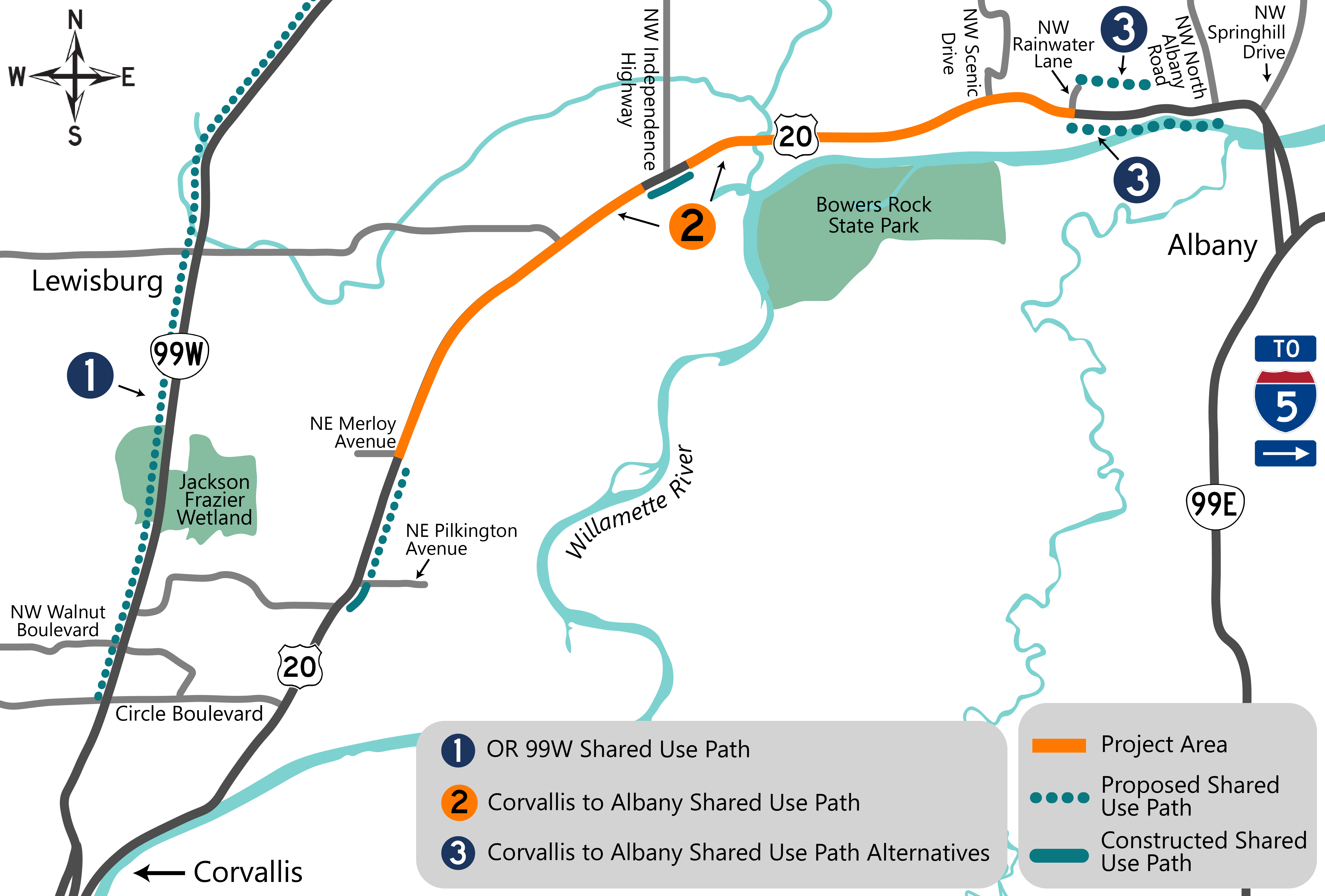 Benton County is planning a shared use path for walking, biking and rolling more safely between Corvallis and Albany. It will also help reduce greenhouse gas emission in the area by providing an alternate to driving between these communities.