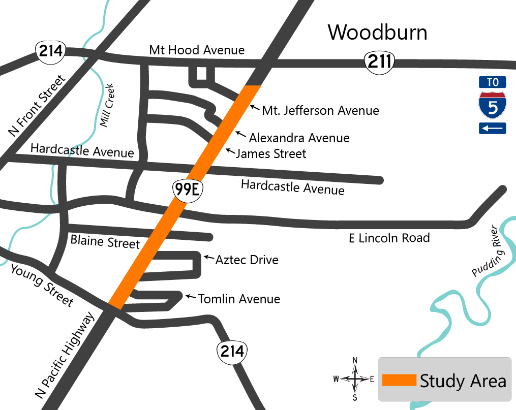 We're studying OR 99E between Mt. Hood Avenue and Young Street to see what can be improved before any future maintenance or other projects are planned. With this study, we will look for funding to include the improvements along with other necessary work to make best use of our limited resources.