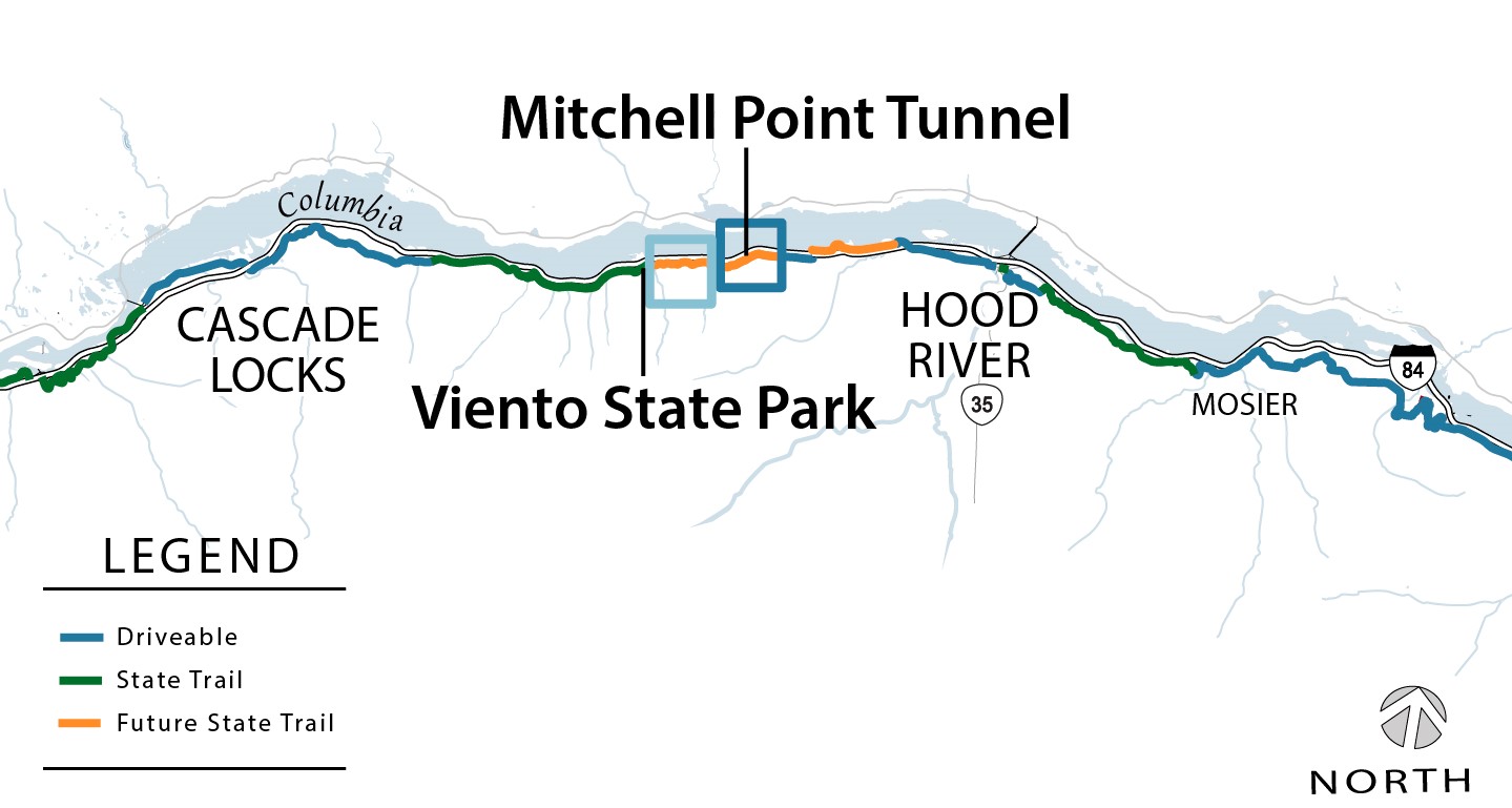 The next 0.25 miles of State Trail is currently in design will head eastward from Mitchell Point Tunnel on Mitchell Point Drive and create a bicycle and pedestrian undercrossing beneath I-84.