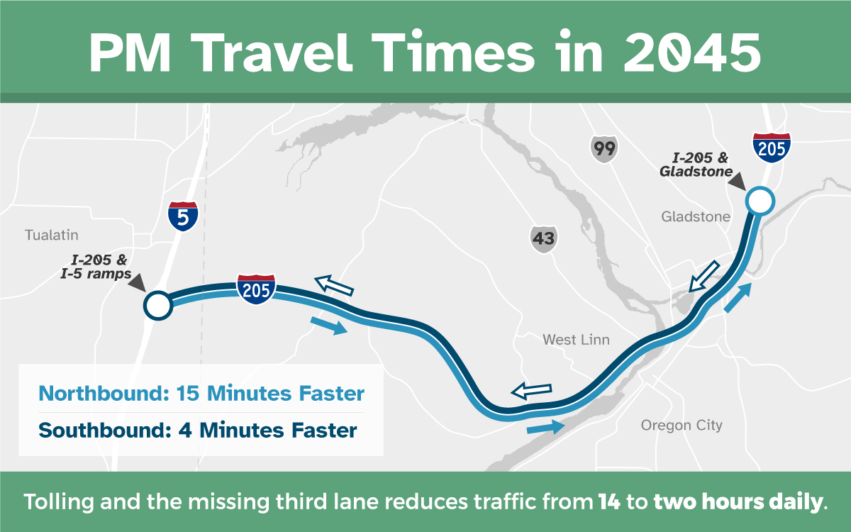 Without tolls and planned improvements, I-205 will see daily congestion increase to 14 hours per day by 2045 as the region's population grows. Diversion to local streets, which is already an issue near the I-205 corridor, will also increase. However, with corridor improvements and tolling, congestion on I-205 would be reduced to two hours or less per day in 2045, and there would be nearly 20% fewer crashes.
