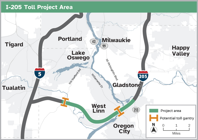 Project study area – the area where ODOT is making improvements. Potential toll gantry – Toll collection points at the Abernethy and Tualatin River bridges.