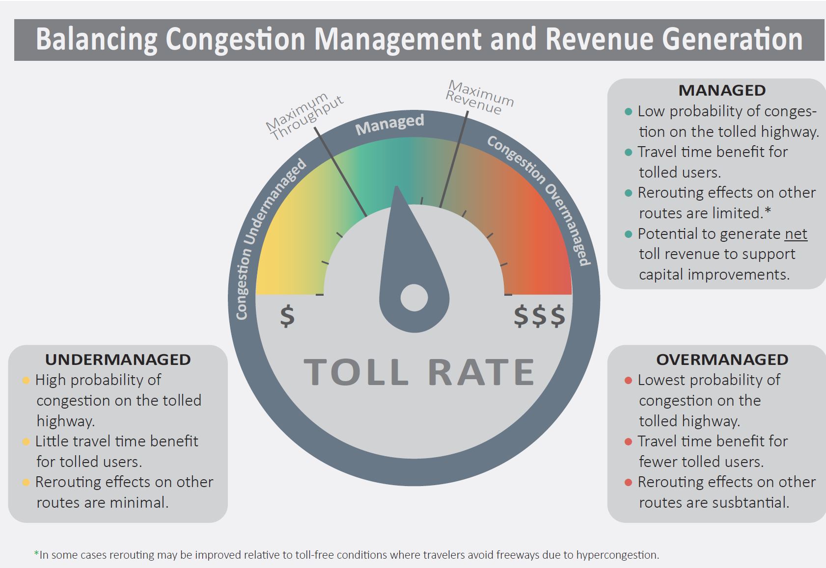 Congestion pricing through variable rate tolls provides more predictable travel times. There will be a set schedule of toll rates to charge drivers a higher price during peak traffic periods at congested locations and lower toll rates during non-peak hours when there is less traffic. It also means drivers will know the prices before heading out.