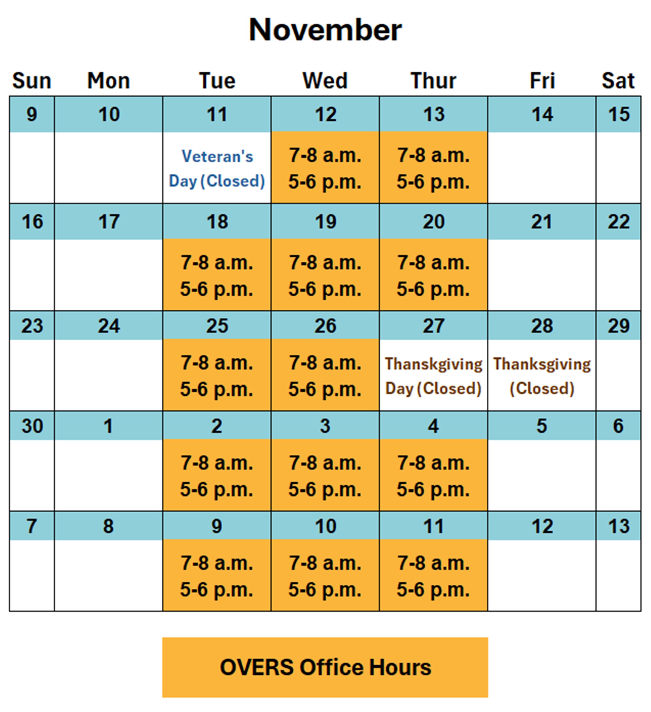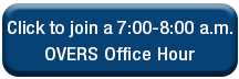 The OVERS office hours will be held twice a day on Tuesdays, Wednesdays, and Thursdays from 7:00 – 8:00 a.m. and 5:00 – 6:00 p.m. Pacific Time beginning Wednesday, November 12. The last day with office hours will be Thursday, December 11th.