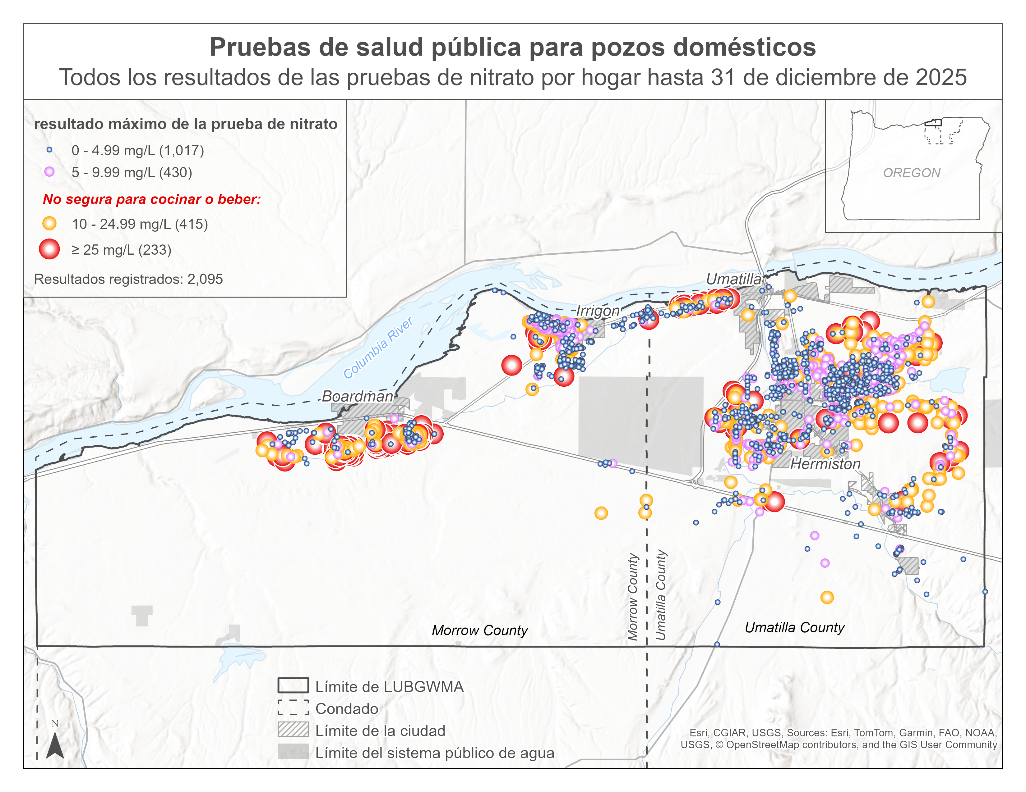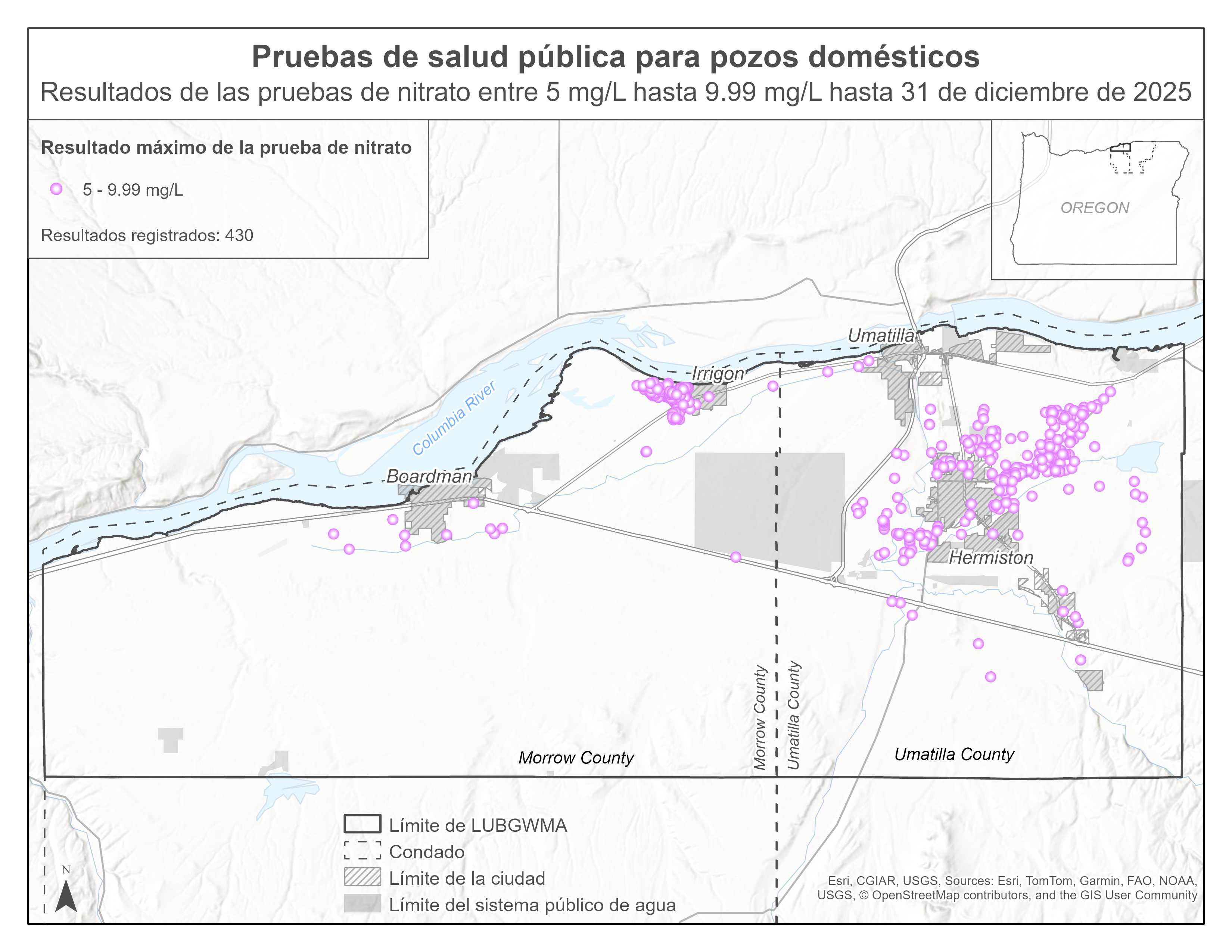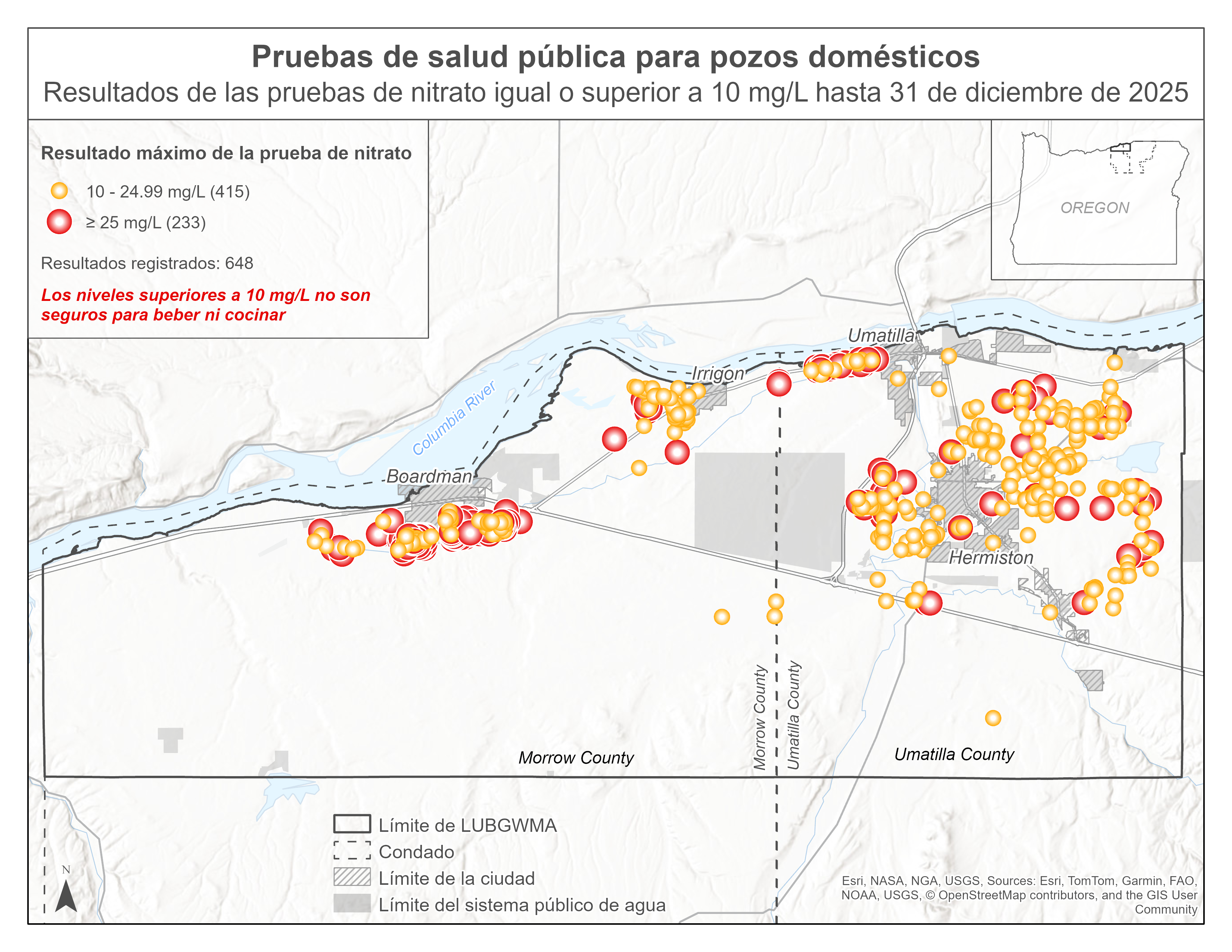 La Autoridad de Salud de Oregón (OHA) está trabajando con sus socios, el Departamento de Servicios Humanos de Oregón, el Departamento de Salud Pública del Condado de Morrow, el Departamento de Salud del Condado de Umatilla y organizaciones comunitarias para brindar servicios gratuitos de agua potable a los hogares en el norte de los condados de Morrow y el noroeste de Umatilla afectados por altos niveles de nitrato. Esta es el área conocida como Área de Manejo de Aguas Subterráneas de la Cuenca Inferior de Umatilla, o LUBGWMA por sus siglas en ingles.
