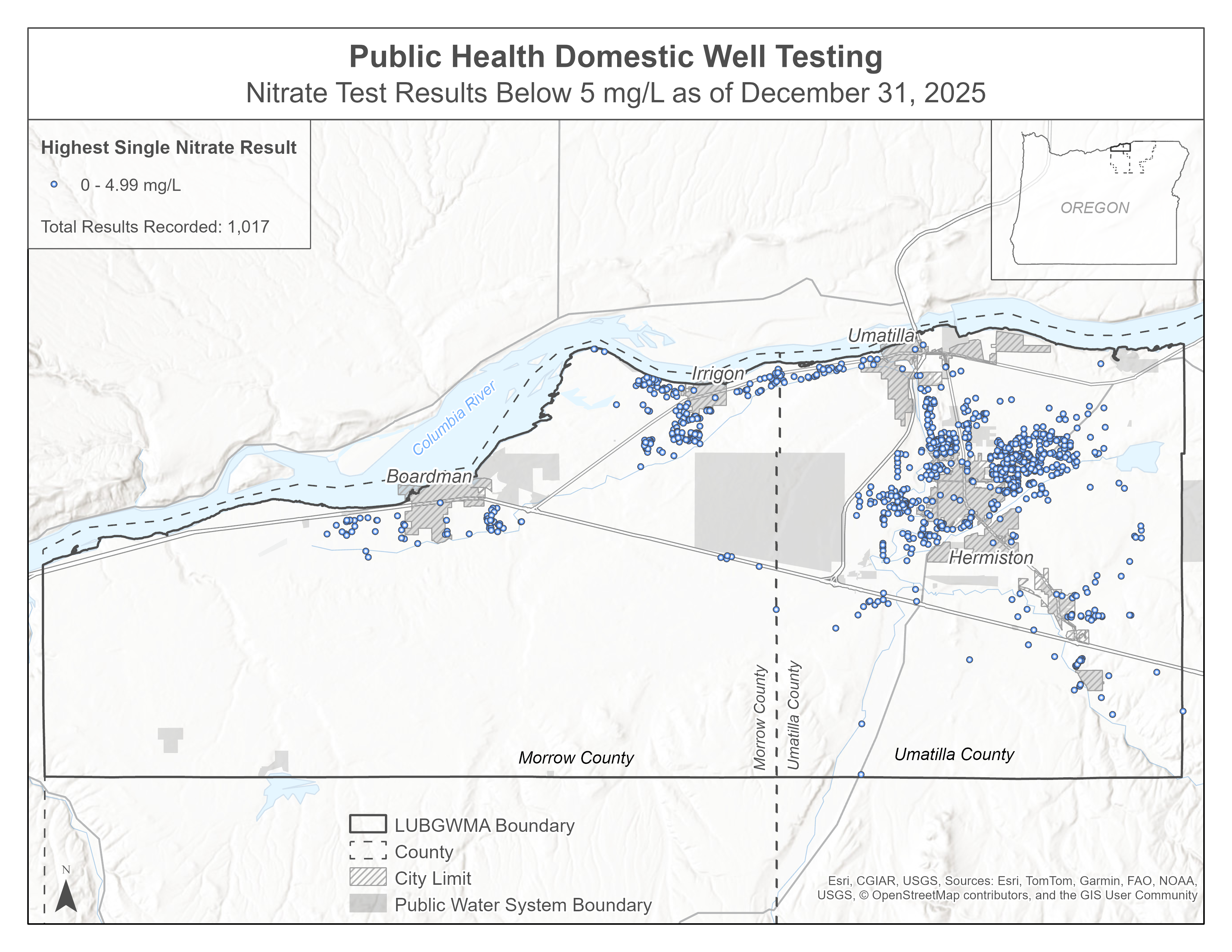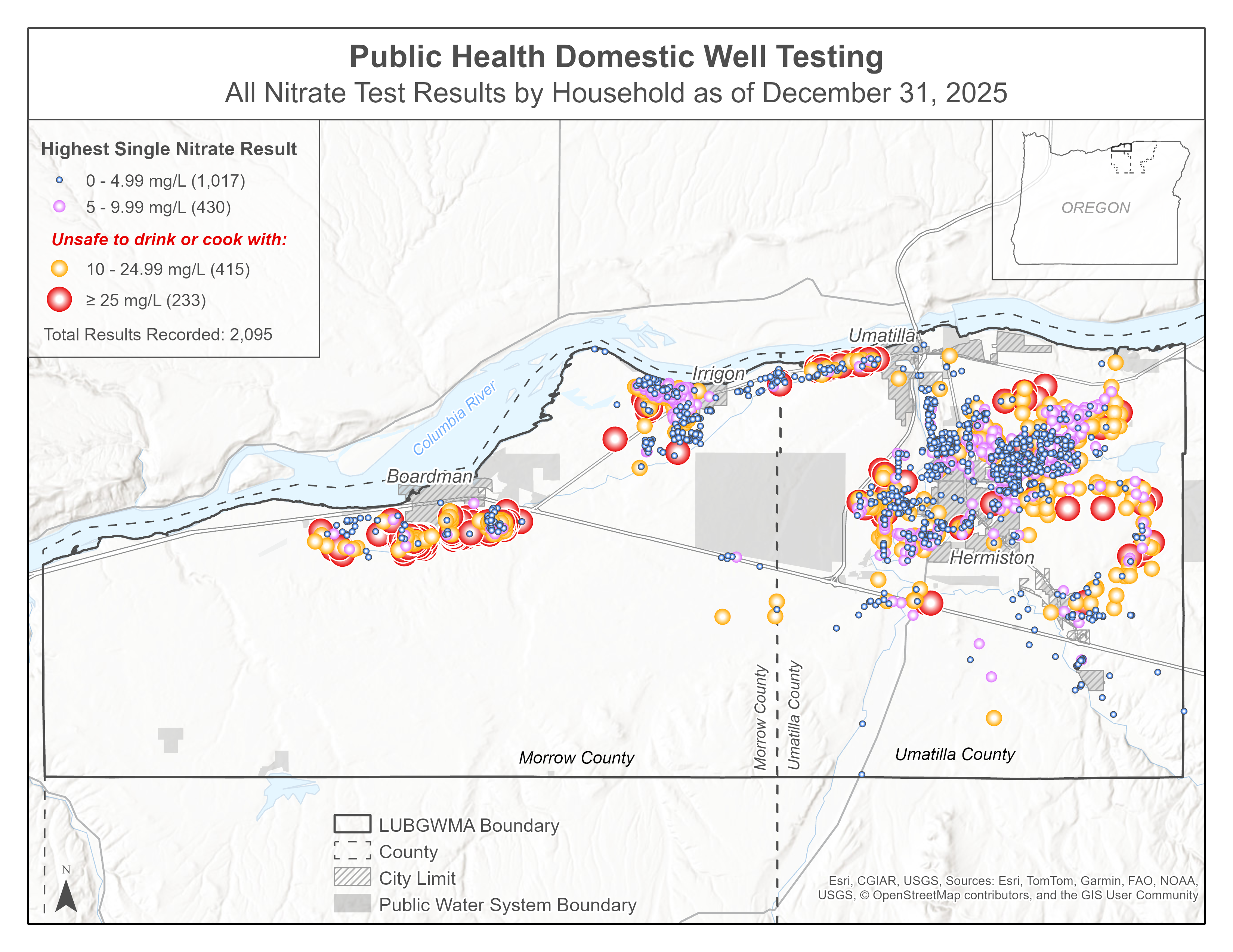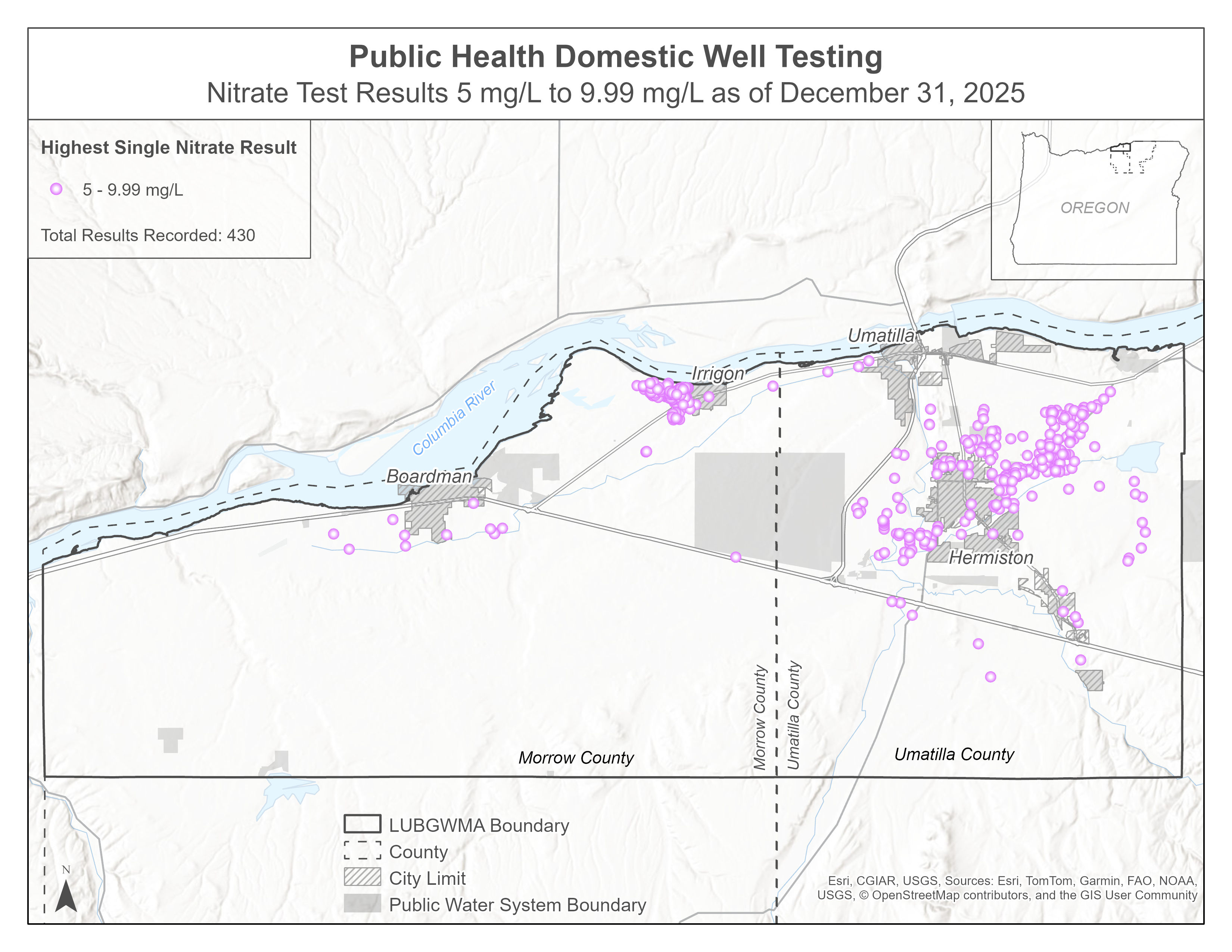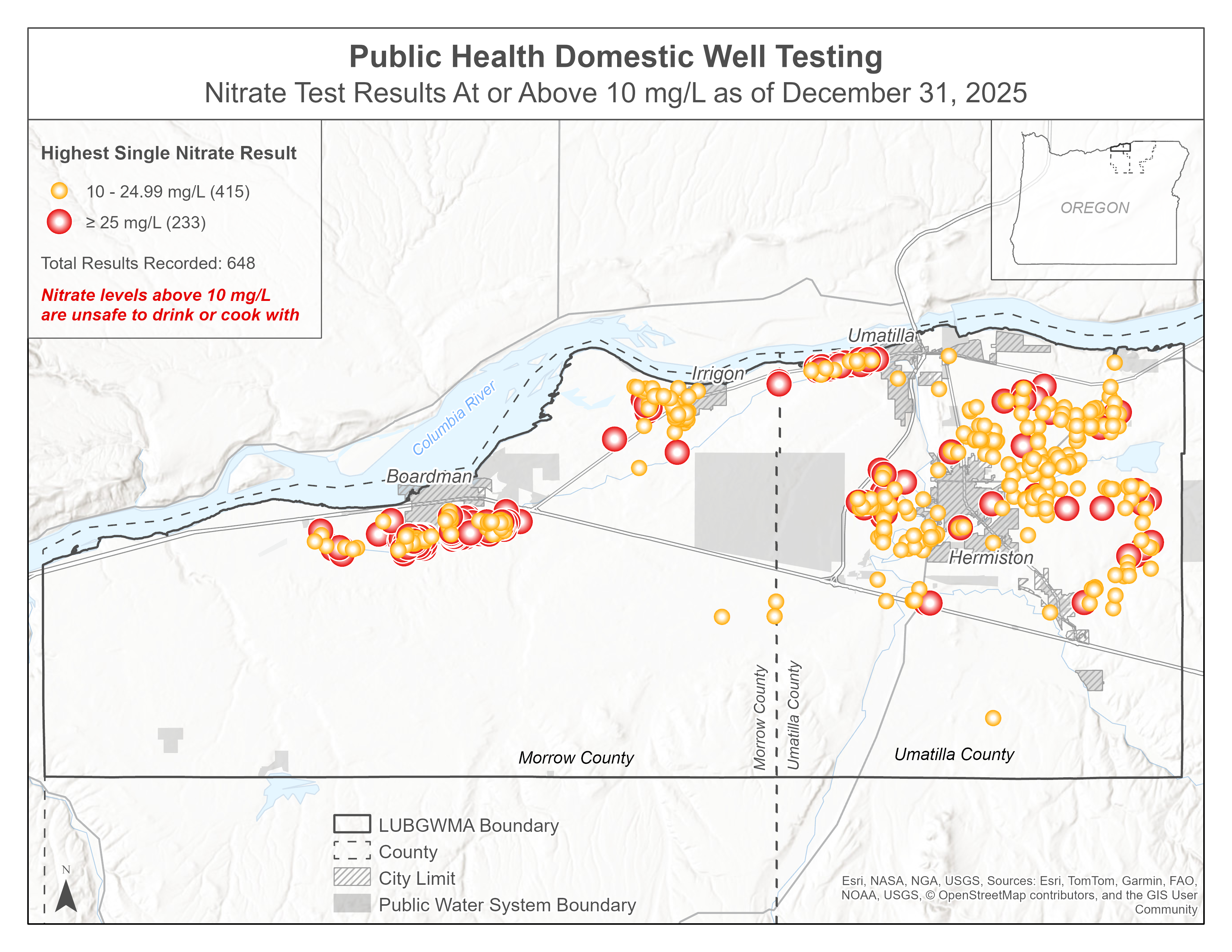 The Oregon Health Authority (OHA) is working with its partners the Oregon Department of Human Services, Morrow County Public Health Department, Umatilla County Health Department, and community based organizations to provide free safe water services to households impacted by high nitrate levels in northern Morrow and northwestern Umatilla counties. This is the area known as the Lower Umatilla Basin Groundwater Management Area (LUBGWMA). Nitrate levels at or over