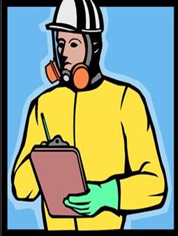 clipart image of man wearing yellow protective gear, hat and face mask while writing on a clipboard