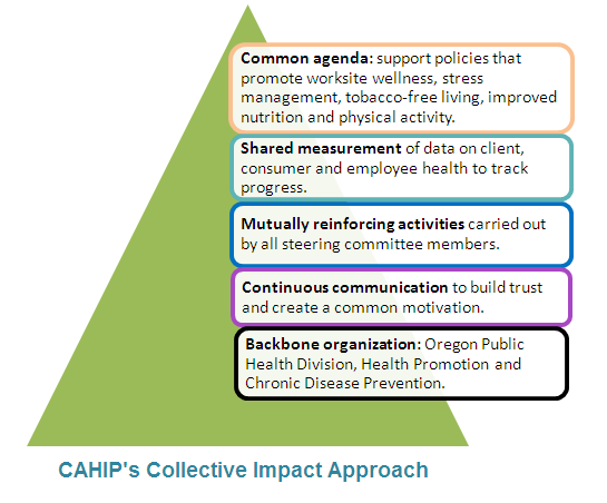 CAHIP uses the "collective impact" model. This model helps different groups work together on a common agenda to solve a specific social issue.
