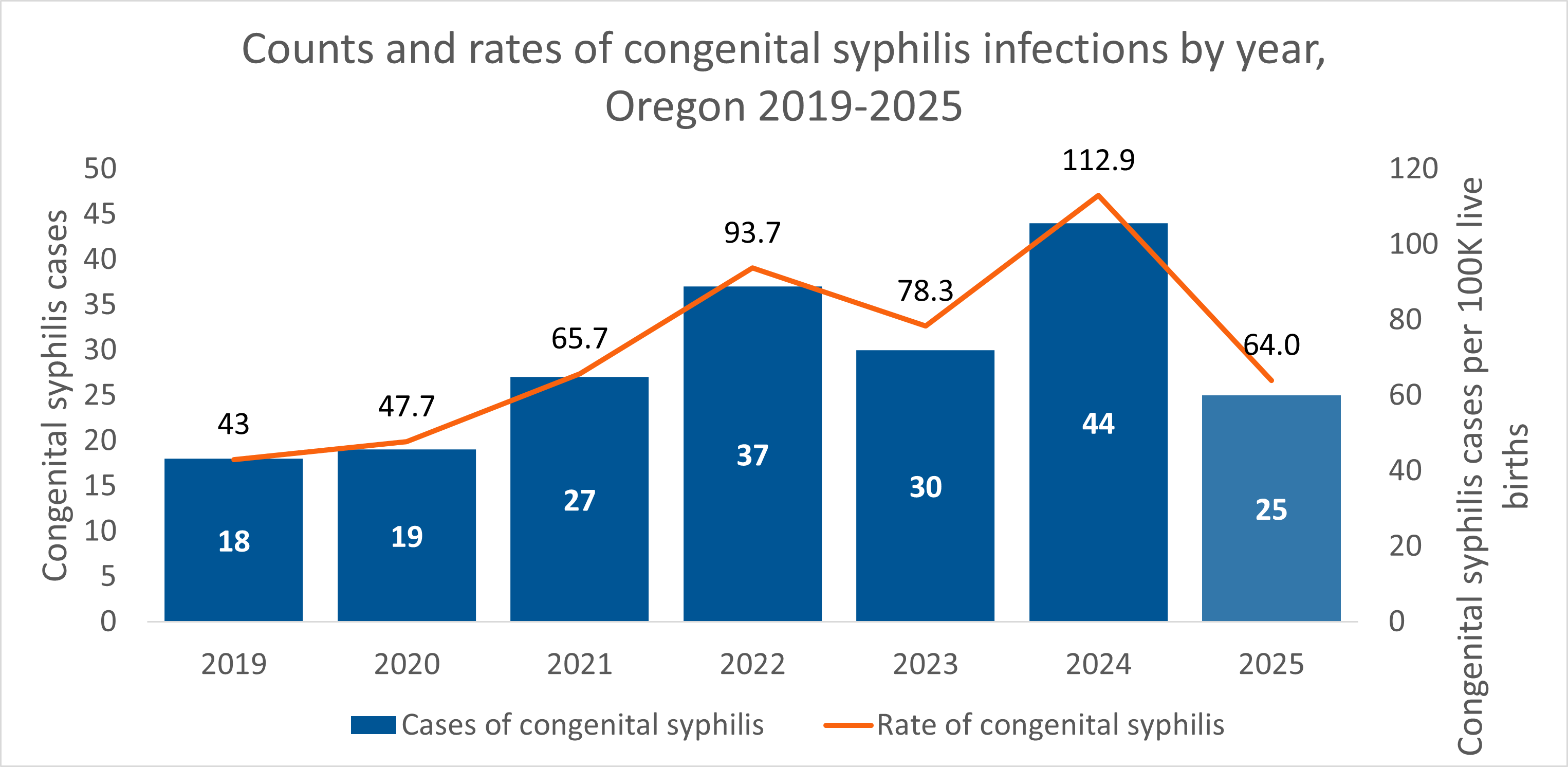 Figure 4. Congenital syphilis counts and incidence rates are confirmed and presumptive surveillance cases. Rates are new diagnoses per 100,000 live births.