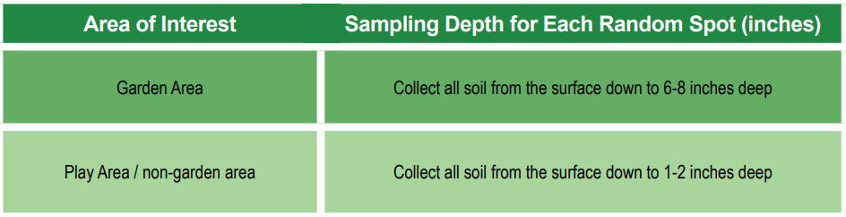 For a small area, collect soil from 3 random spots and combine in a clean container. (See table below for sampling depth per spot.)