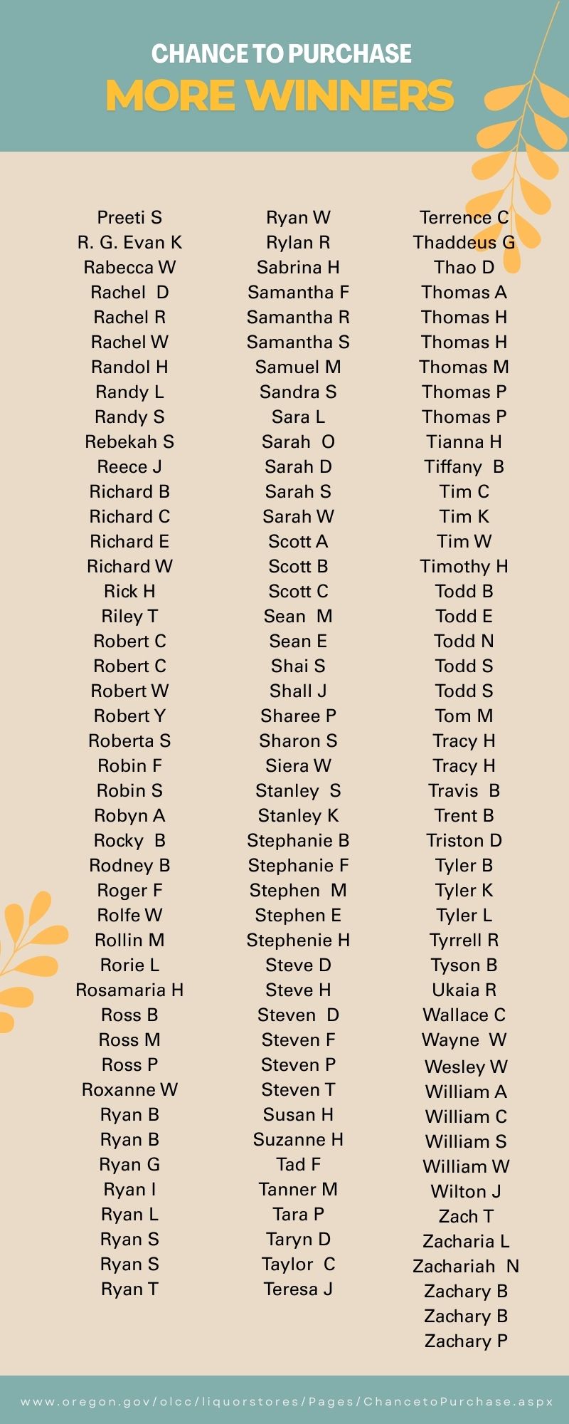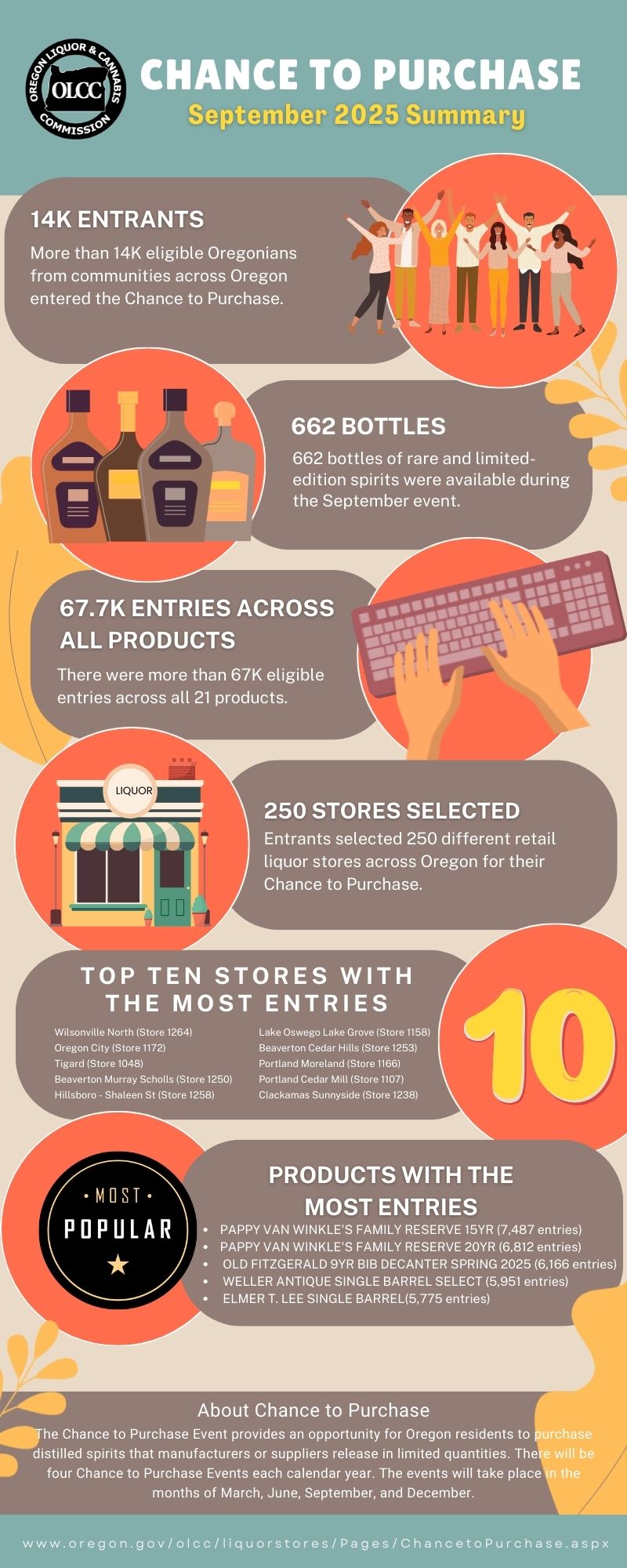 Employees of the OLCC, a Retail Sales Agent or an individual representing an agent that is a legal entity (Agent Representative) are not eligible to participate. OLCC may disqualify any person from participating in this or future Events for failure to meet these qualifications or for any other conduct deemed by OLCC to be inconsistent with the state alcohol laws and regulations or the requirements of this drawing. OLCC is not obligated to sell the winner an item if the person would not ordinarily be allowed to make a purchase under Oregon’s laws, the bottle becomes unavailable, or OLCC is precluded by other laws or legislative actions that prohibit it from selling the item.