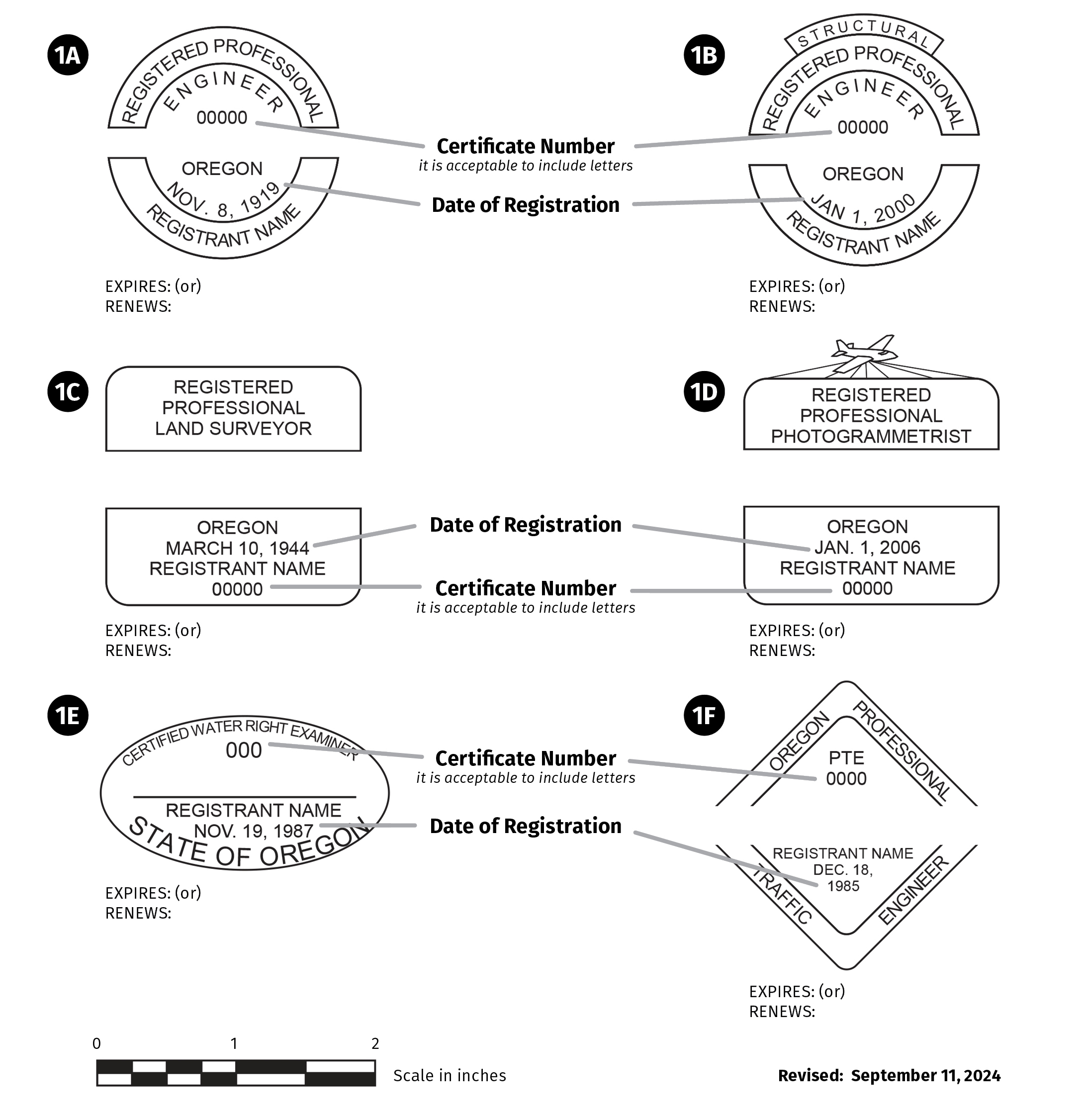 (2) The size of the seal must be at least 2 inches from point to point. The design and content of the seal will be an exact replica, in style, of the examples shown in Exhibit 1 (Official Seals) for the profession or branch of the profession in which the registrant is licensed. The expiration or renewal date may be made part of the seal. If the expiration or renewal date is not made part of the seal, it must be handwritten, in permanent ink, after the word "Expires" or “Renews." Reduced or enlarged seals are not permitted on final documents. (for full text, see OAR 820-025-0005)