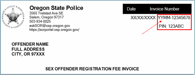 The statute for payment is listed on the invoice. If you are: A) a registered sex offender in Oregon; B) living, working, and/or going to school in Oregon, and; C) not on supervision (for the sex crime that requires you to report) on your DOB for the year being billed, you will be sent an invoice and required to pay the registration fee.