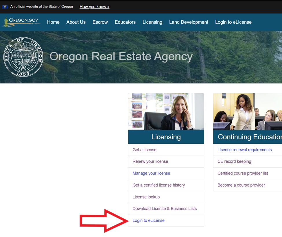 Step 2 From the Agency's home page at www.oregon.gov/rea, click the "Login to eLicense" button.
